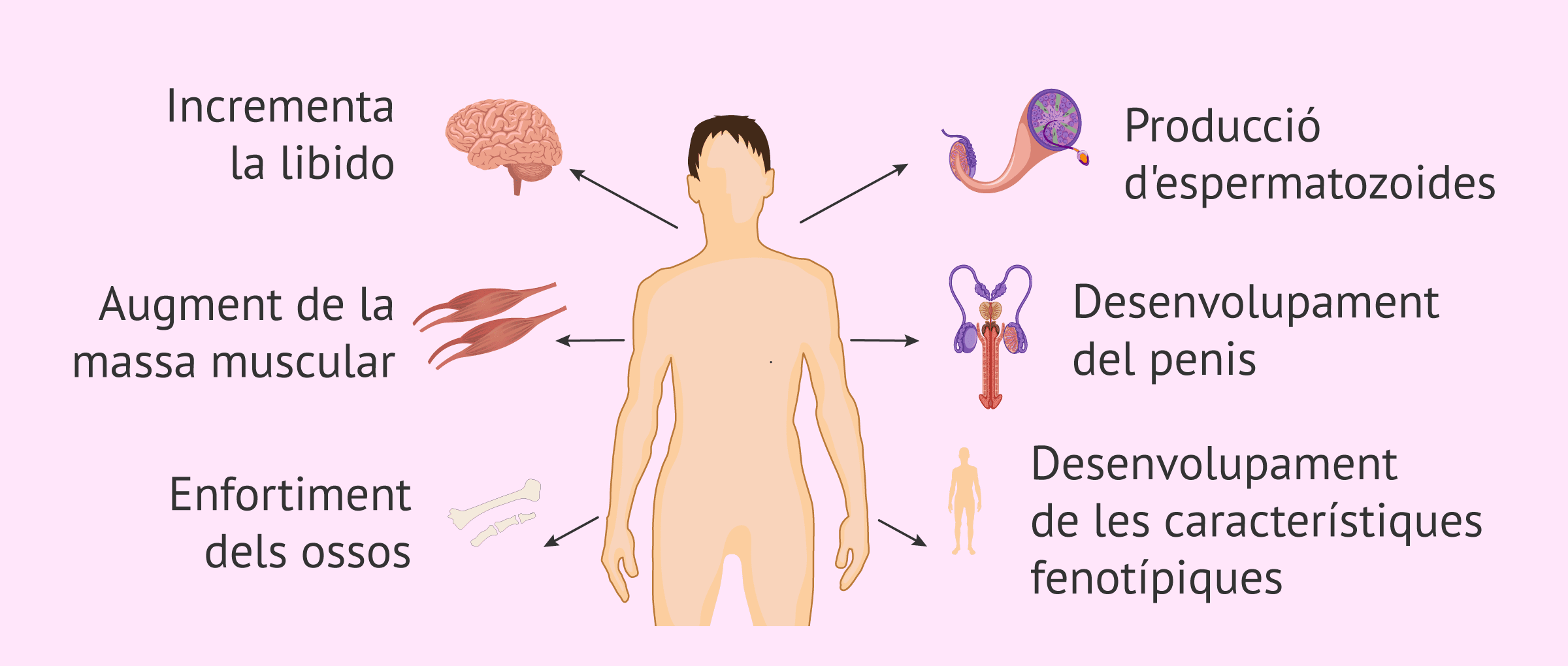 L'hormona testosterona compleix amb múltiples funcions en el cos de l'home, sobretot després de la pubertat. Algunes d'aquestes funcions són les següents: