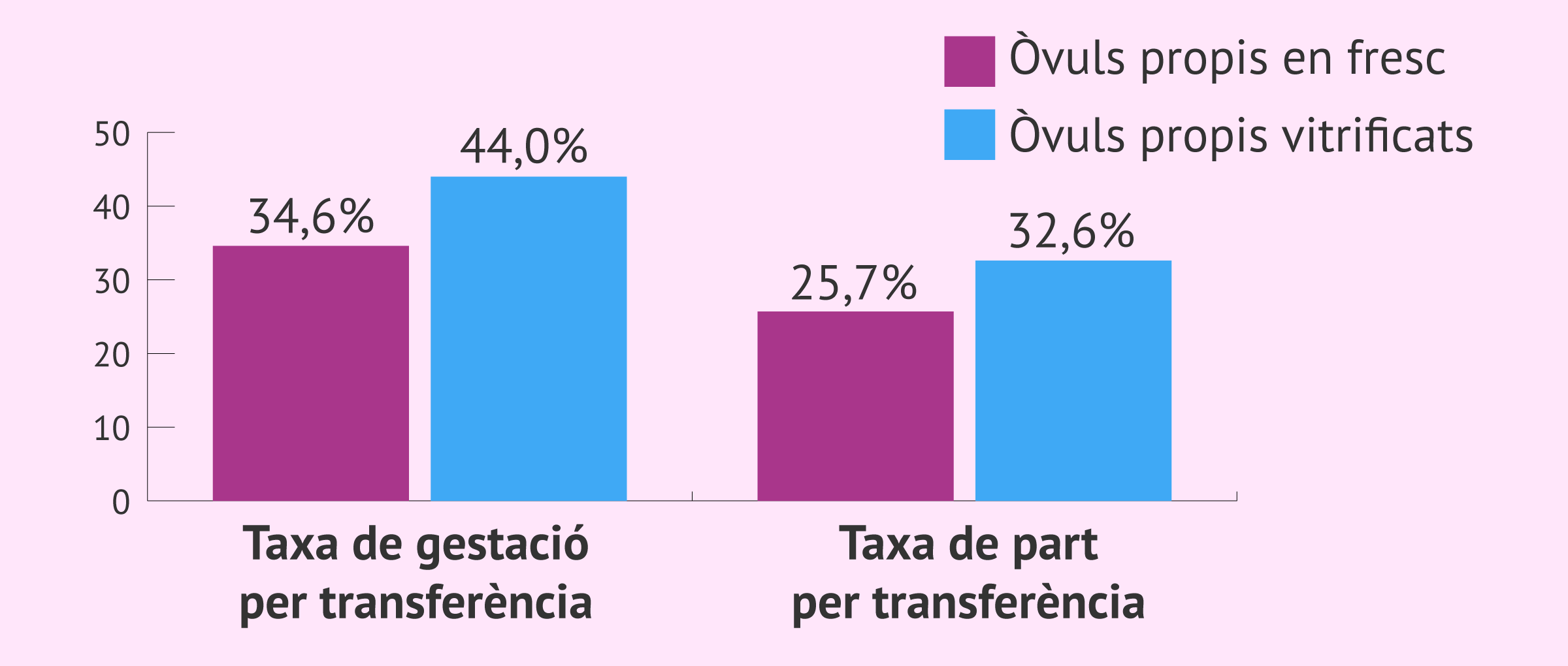 - Òvuls propis congelats: la taxa de gestació per transferència va ser del 44,0%; mentre que la de part va ser del 32,6%